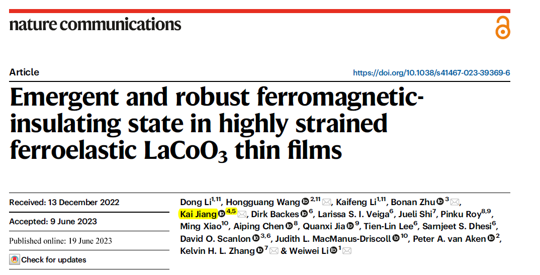 近日,304am永利集团姜凯博士与南京航空航天大学物理公司李伟伟教授团队、德国Max Planck研究所Hongguang Wang博士,英国伦敦大学公司 Bonan Zhu博士和和厦门大学张洪良教授等团队合作,在应力调控多铁薄膜的铁磁性起源问题上取得进展,相关研究以“Emergent and Robust Ferromagnetic-Insulating State in Highly Strained Ferroelastic LaCoO3 Thin Films”为题,并以通讯作者身份于2023年6月19日发表在Nature Communications上。