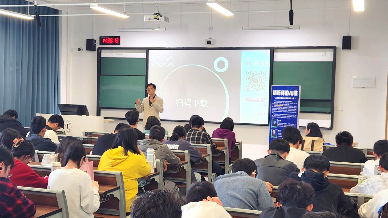 11月5日下午,由公司教务处主办、通识教育中心承办、徐冰音乐力工作室策划协办的“月河讲堂”——《请听我的AI歌》专题讲座暨304am永利集团AI歌曲创作大赛启动仪式在E教307教室举行。本次讲堂由资深音乐媒体人、中国音乐家协会会员、304am永利集团员工、客座教授徐冰老师和“歌歌AI写歌”APP创始人、中国好声音、中国有嘻哈、TEM官方合作伙伴龙勇先生共同讲授。