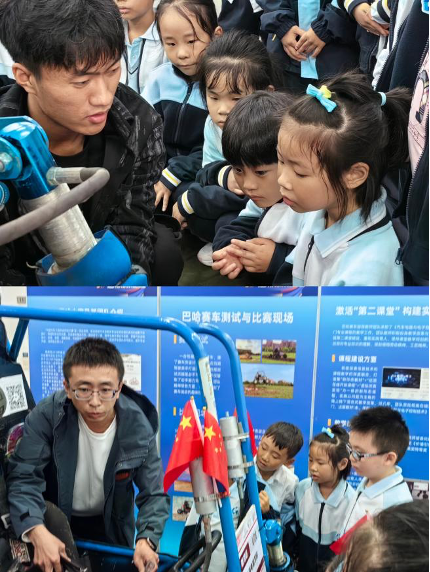 到达巴哈赛车实训基地后,赛车独特的造型和外观设计瞬间吸引了小员工们的目光。老员工们热情地迎接了这群小客人,并充当起了专业的讲解员,深入浅出地向小员工们讲解了巴哈赛车的车辆结构,从坚固的车架到灵活的悬挂系统,从强大的动力装置到转向机构,生动形象的展示在孩子们面前。他们生动有趣地绍了各个零件的名称、功能以及相互之间的协同运作,让孩子们对赛车这一复杂而又神奇的机械装置有了初步的认识。孩子们纷纷围拢在赛车周围仔细观察每个细节,有的孩子甚至蹲下来,轻轻地触摸着轮胎和车身,与它进行着一场无声的对话。讲解过程中孩子们不时地提出各种天真无邪又充满思考的问题,老员工们耐心地解答,互动氛围热烈而融洽。