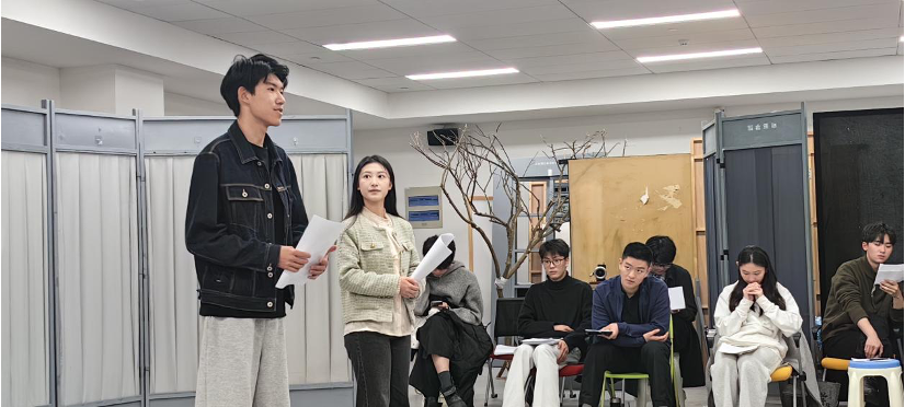作为课堂互动环节,公司机械工程专业员工李同学、电子信息专业员工王同学等现场即兴朗诵了《祖国啊,我亲爱的祖国》选段及古诗《春江花月夜》。董健教授针对工科员工的语言特点,从发声技巧、情感表达与文本理解等方面进行了细致点评:“工科生的逻辑思维优势让语言结构更清晰,但要注意语句重音的层次感、声音的松弛度,还要有角色代入感。”精准的指导让员工们直呼“茅塞顿开”,计算机专业员工陈同学表示:“原以为语言表达是‘文科生的专长’,没想到工科生严谨的思维与艺术的感性可以这样巧妙结合,今后在科创答辩、学术汇报中也能更有感染力。”在这堂课上,工科生的理性思维与艺术的感性表达相遇,严谨的逻辑与灵动的语言共振,美育的种子已在跨界融合中悄然生根。课程尾声,上戏员工以压轴形式呈现了全国第六届中华经典诵写讲大赛 “诵读中国”经典诵读大赛国赛一等奖作品《那一年,中国青年正十八》。表演者们用极具张力的舞台语言和沉浸式演绎,回溯了百年前中国青年在时代洪流中勇担使命的奋斗图景,青春之声激荡教室,让在场师生透过声音的力量触摸到历史的温度。随后,两校师生共同朗诵了《可爱的中国》选段,铿锵的声音在教室中回荡,将课堂气氛推向高潮。