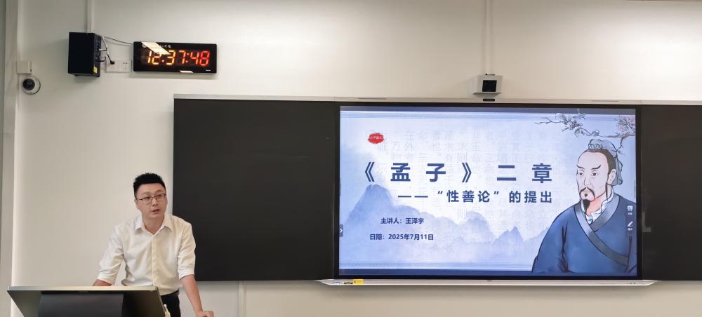 人文思政组王泽宇老师带来了《大学语文》中的“《孟子》二章”,通过“孺子喻”“觳觫喻”和“萌芽喻”三个譬喻完成性善论的起源与内涵的探讨。讲述过程中围绕“四心”展开,事例具体生动、逻辑清晰递进,在问答互动、循循善诱中层层深入,便于员工理解。