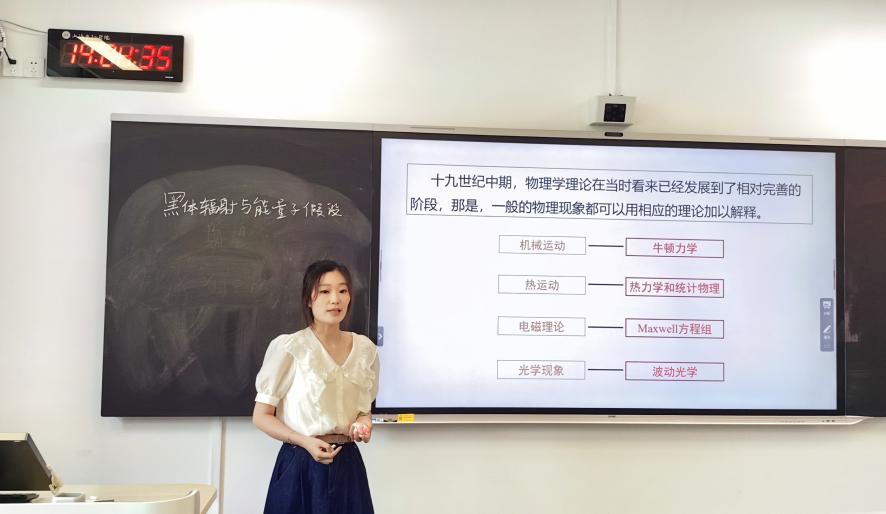 自然科学基础组梁盼老师的《大学物理》的“黑体辐射与普朗克能量子假设”。授课过程中PPT和板书采用思维导图的方式呈现,增强了员工对本节课知识体系的理解。在教学过程中,通过多次提问激发员工的思考。