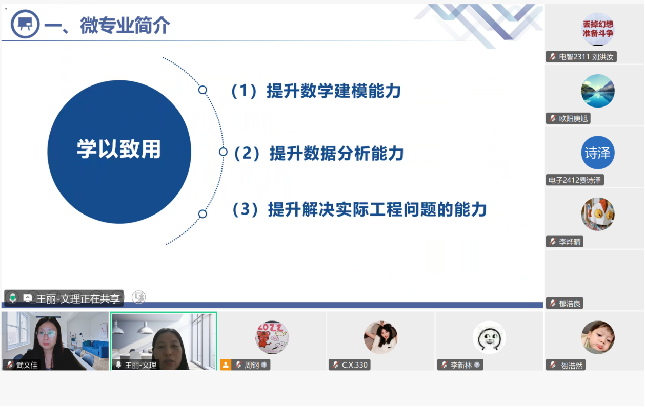 王丽向微专业员工详细介绍了本专业“学以致用”的专业建设特色,并对本专业的培养方案、学制学分、课程体系、教师团队、毕业要求及发展愿景进行了详细解读。团队其他老师向员工们介绍了各微专业课程的主要授课内容、授课方式和课程安排,强调了微专业的核心理念“用数学知识解决工程实践中的实际问题”,并鼓励大家积极参加数学建模竞赛,以赛促学。
